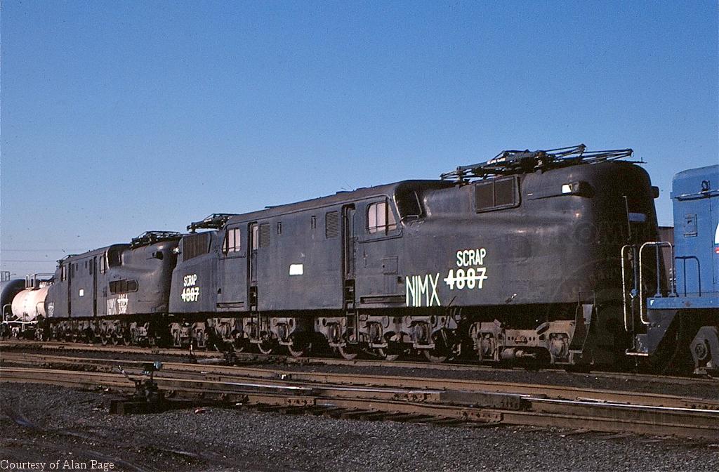 Ex-PC SW7 8897 pulls Naparano Iron and Metal-branded GG-1's 4864 and 4887 to scrap at Newark, NJ in February, 1982.