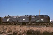 February 15, 1982 was a sad day for the fans of the engineering and styling excellence that was the GG-1 locomotive. Ex-PC SW7 8897 pulls Naparano Iron and Metal-branded GG-1's 4864 and 4887 to scrap at Newark, NJ.