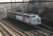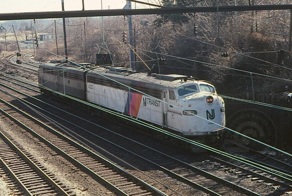 One of two E-8As painted in white NJ Transit colors, former PC 4323, joins NJDOT E-8A 4267 (ex-PC 4251 rebuilt by ICG in 10/1978) at South Amboy in March, 1982.