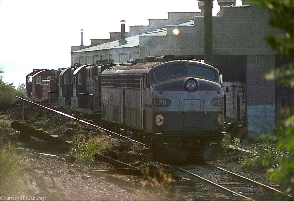 CR-operated E-8A 4320 rests with a pair of ex-PC Alco RS-11's and CR SW-7 8877 (ex-LV 222) beside the South Amboy diesel shop. Former PC 4320 was rebuilt by GE in 5/1977 and sports NJDOT colors on July 10, 1977.