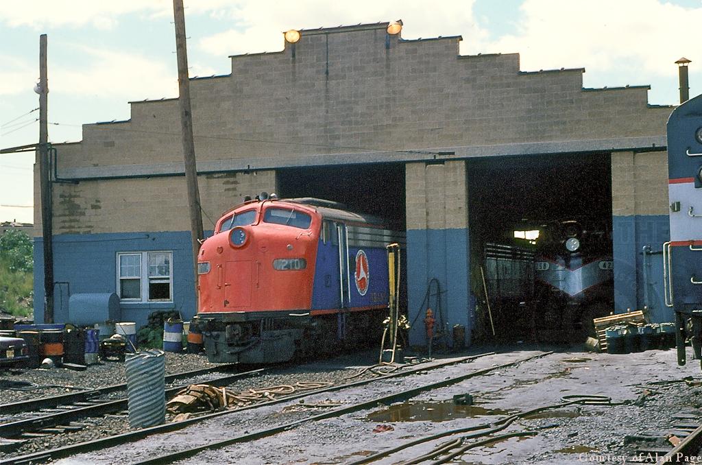 To supplement CR-contracted ex-PC E-units, NJ Transit leased NTSB E-8A 210 (ex-Amtrak 210, nee-B&O 1463) until May, 1981. The E-unit receives service alongside repainted ex-PC E-8A's at the South Amboy engine facility in August, 1979.