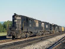 A D&H train with N&W power arrives at Hornell for a crew change. One has to wonder if the crews wouldn't have prefered that new SD-40-2 to be leading.