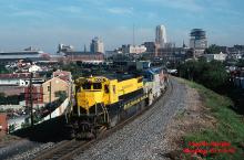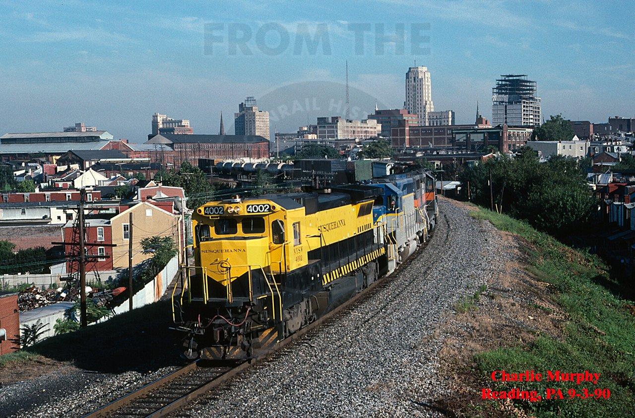 On the ex-Reading portion of Conrail, traffic between Allentown and Philadelphia had two routings at Reading, PA; through the city or around it via the Reading Belt Line. While a large majority of the D&H trains used the Belt, the actual trackage rights agreement explicitly only included using the route through Reading in part to give it the slowest routing possible and dispatchers still frequently did their part to oblige. On Labor Day weekend 1990, D&H symbolled RPPY (Rouses Point, NY - Potomac Yard) snakes its way on the slow route through Reading. Behind the NYS&W B40-8 are four ex-Reading GP39-2's taking one last Ride on the Reading. With the sale of the D&H to CP Rail, the new less than a year-old lease between the D&H and CSXT for the 20 GP39-2's was cancelled, and the units are being turned over to CSX.