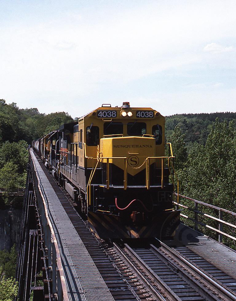 An Eastbound NYSW freight crosses the Portage Trestle. NYSW took over D&H operations for a couple years and bought 20 B40-8s for that purpose. When CP took over the D&H, the 20 new B40s went to CSX, who had financed their purchase.