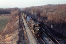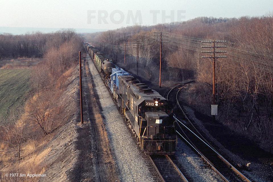 Eastbound freight with a GP9B second unit & GP9 trailing unit on the Buffalo Line main track. Unoccupied track is Fair Siding, and the siding going off to the right serviced a coal grinding operation.