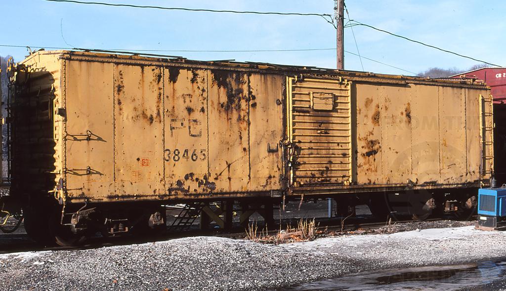 PC 38465 is seen at Sewickly PA on 2/7/98. Car is ex PRR 1921 and was built 7-34.