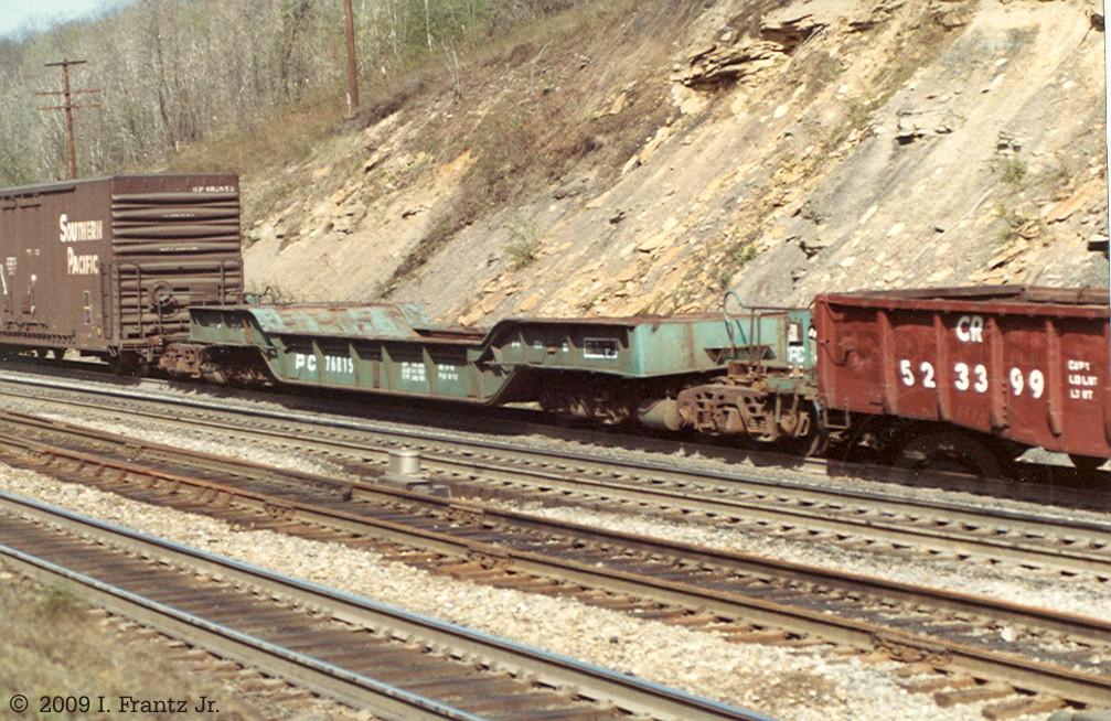 Conrail/Penn Central F40 Heavy-duty flatcar is seen westbound at BENNY Interlocking. Originally built as a one-car class by the PRR in 1954, the car was built to a capacity of 500,000 lbs, though PRR equipment diagrams indicate the car could hold an additional 4 tons if the weight of the load was concentrated on the center 24' of the well. It featured a 30' long well, 8'10" wide, 3'-7" above the top of rail. The car was 92'-8 1/2" long over strikers.