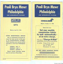 The Paoli Bryn Mawr to Philadelphia April 25, 1976 timetable shows the new "ConRail" logo, with lines above and below. A second revision of the timetable in October 31, 1976 shows the familiar "CONRAIL" and wheels on rails logo alongside. In addition, "SEPTA" has been removed from below the "ConRail" logo and spelled out as "SOUTHEASTERN PENNSYLVANIA TRANSPORTATION AUTHORITY" at the bottom of the table. Also, the "DO NOT CROSS RAILROAD TRACKS" warning was added at the bottom. Unlike the RDG Division commuter timetables that did not show the "ConRail" transition until May, 1976, the PC versions showed the transition by the end of April.