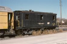 Looking like an ancient boxcab diesel, Penn Central steam heater car X-H2 sits with a MOW passenger car at Harrisburg in April, 1984.