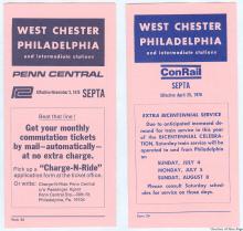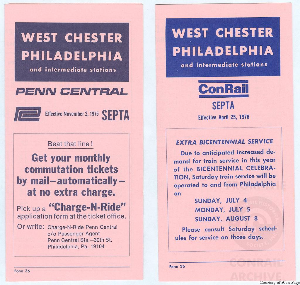 During Septa's Philadelphia commuter operations transition from PC-contracted operations to ConRail in April, 1976, the "West Chester to Philadelphia" April 25, 1976 timetable shows "Penn Central," and the PC logo, replaced with the new "ConRail" logo, with lines above and below.