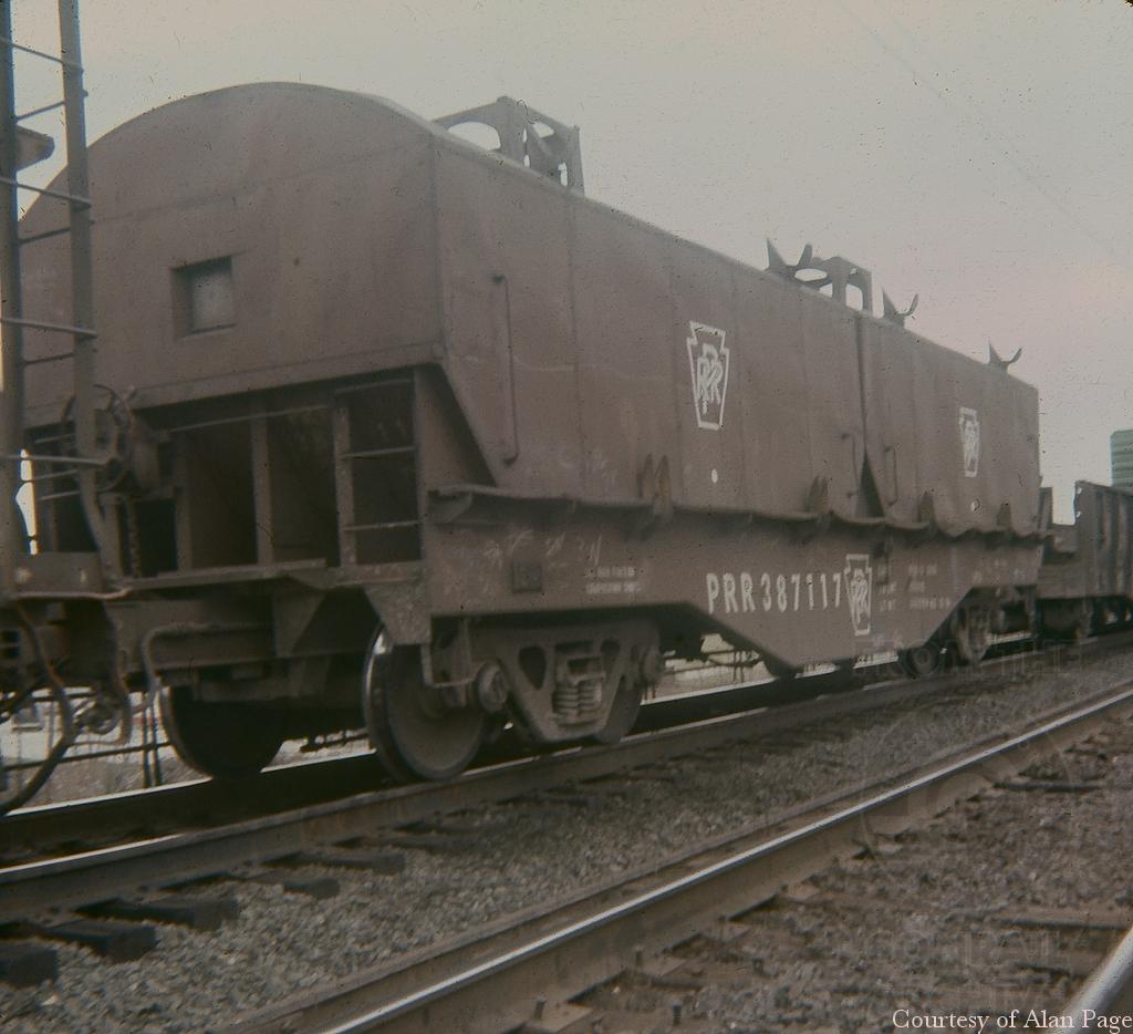 PRR Coil car 387117 in a mixed freight on the Trenton Cutoff at Willow Grove in December, 1976.