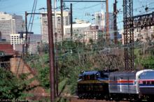 PRR GG-1 4935 passes by Arsenal Tower in Philadelphia during it's inaugural run from Union Station to New York.