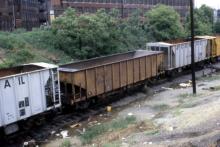 PRR Ballast Hopper #496636 in a ballast train consist at "A" St. near Lehigh Ave. in Philadelphia, PA. May 19, 1979