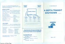 Previous Next Conrail notified commuters in March 1977 with this foldout bulletin, prior to the Septa Transit Worker's Union (TWU) strike. The strike began March 25, 1977 and was settled on May 8, 1977. Photo By Alan Page Year 1977 Original Date 3/1/77 Subject(s) Conrail Passenger Service Collection CRHS Conrail Photo Archive Contributions