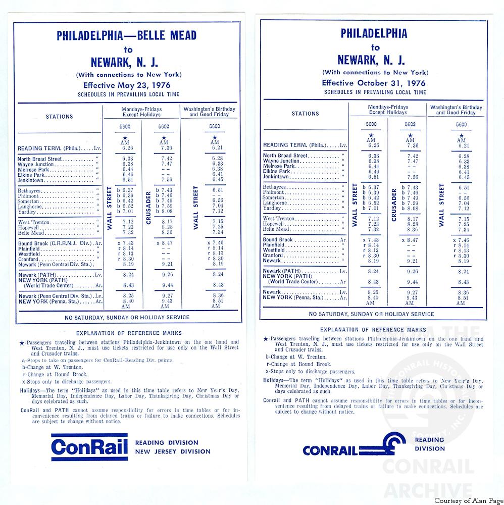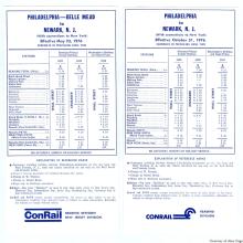 Following the joint Reading Railway System/Central RR Co. of NJ's transition to Conrail-contracted operations on their Reading Division/NJ Division commuter lines in April, 1976, the "Newark to Philadelphia" timetable was revised May 23, 1976 to show the new "ConRail" logo, with lines above and below. The obverse of the second revision of the timetable in October 31, 1976 shows the familiar "CONRAIL" and wheels on rails logo alongside. Also, the "New Jersey Division" has been removed. Unlike the PC Division commuter timetables that showed the transition to "ConRail" in April, 1976, the RDG Division/NJ Division transition timetables did not appear until May.