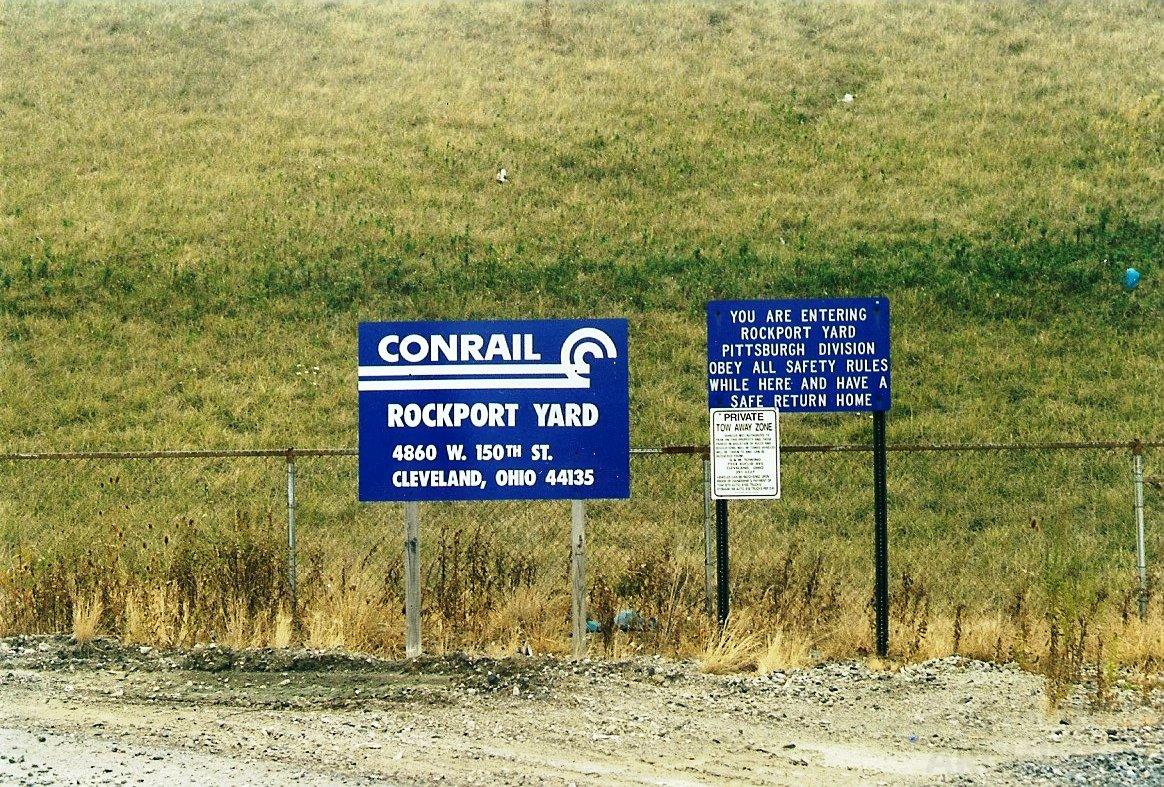 Pictured here is the sign for Conrail's Rockport Yard (back entrance). This sign was located at the west end of Rockport right at the RTA rapid transit Brookpark station parking lot. The west end lead tracks for Rockport Yard join the ex-NYC Chicago Line at what was CP 190 during the Conrail era (now called CP-MAX). This picture was taken in the summer of 1995. The sign was removed shortly after the split and replaced with a new Norfolk Southern Rockport sign. NS now operates Rockport Yard and the Chicago Line between downtown Cleveland and CP-MAX, all the way to Chicago.