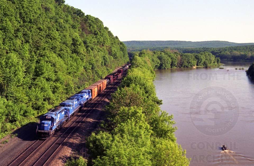 Pittsburgh Line - Aqueduct, Pennsylvania, USA May 19, 1990 SD40-2 6449 on PIMO Big Blue skirts a muddy Juniata River near Aqueduct in a view taken off the US 11/15 overpass just west of Duncannon. Photo by Don Kalkman III