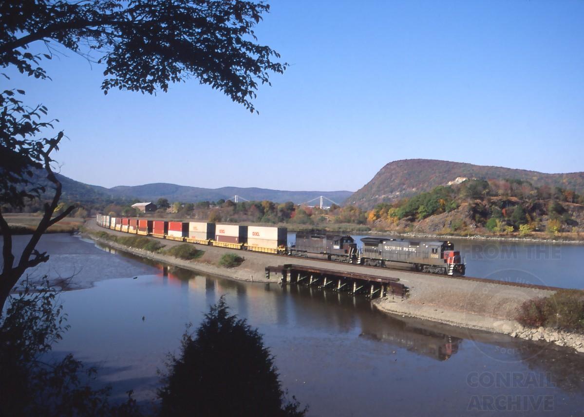 SP 8016 and 7330 take TV556 across Snake Hole Creek at the south end of Iona Island, NY. on Oct. 22, 1992. Solid sets of SP power were common on this particular train at the time.