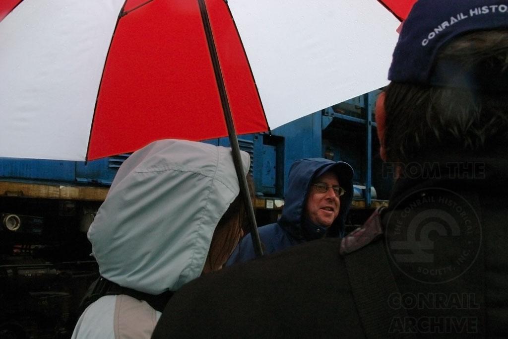 Previous Next Umbrellas were good places to talk. Here Steve Ondik, and Kevin and Jenn Yutz talk while sheltered from the rain. Photo By Ed Kapuscinski Collection CRHS Conrail Photo Archive Contributions
