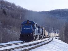 The first of four westbounds in one hour, TV-9X powers into Bancroft, MA. at 08:49 on Feb. 19, 1983 behind a sparse two-unit lash-up.