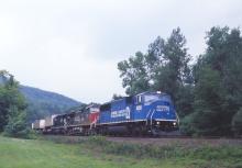 SD60M 5558 with TV6 and some "furriners" near MP 121 in Huntington, MA. on July 2, 1999.