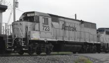 AMTK 723 is seen on Amtrak work train KP701 at Newark DE on 5/3/10. AMTK 723 ex P&LE 2027/CR 7758/PC 7758. The unit was rebuilt at JBS in 1995 for Amtrak.