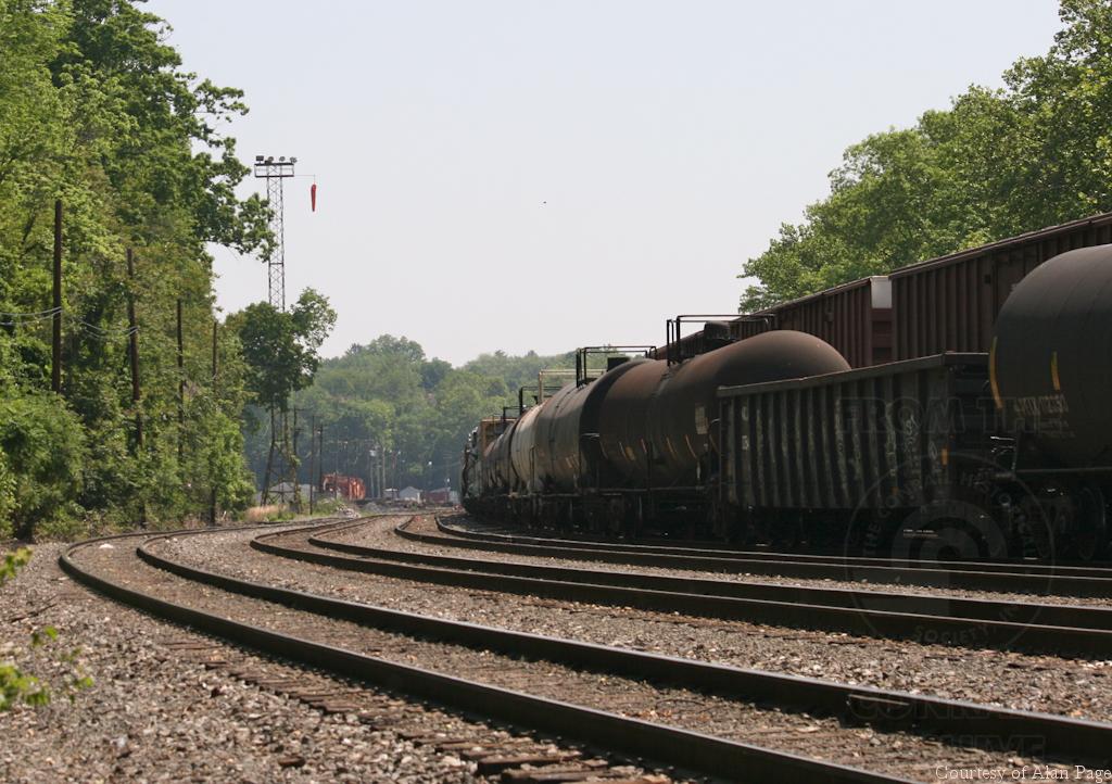 When I last saw this scene in December, 1988, SD40-2's 6334 and 6303 were working the cars, and the view towards the former Bethlehem engine terminal showed both the yard light tower, and the steam-era coaling tower. 28 years later in May, 2016, the light tower remains in use, but the engine terminal, roundhouse, powerplant, and coaling tower are long gone.
