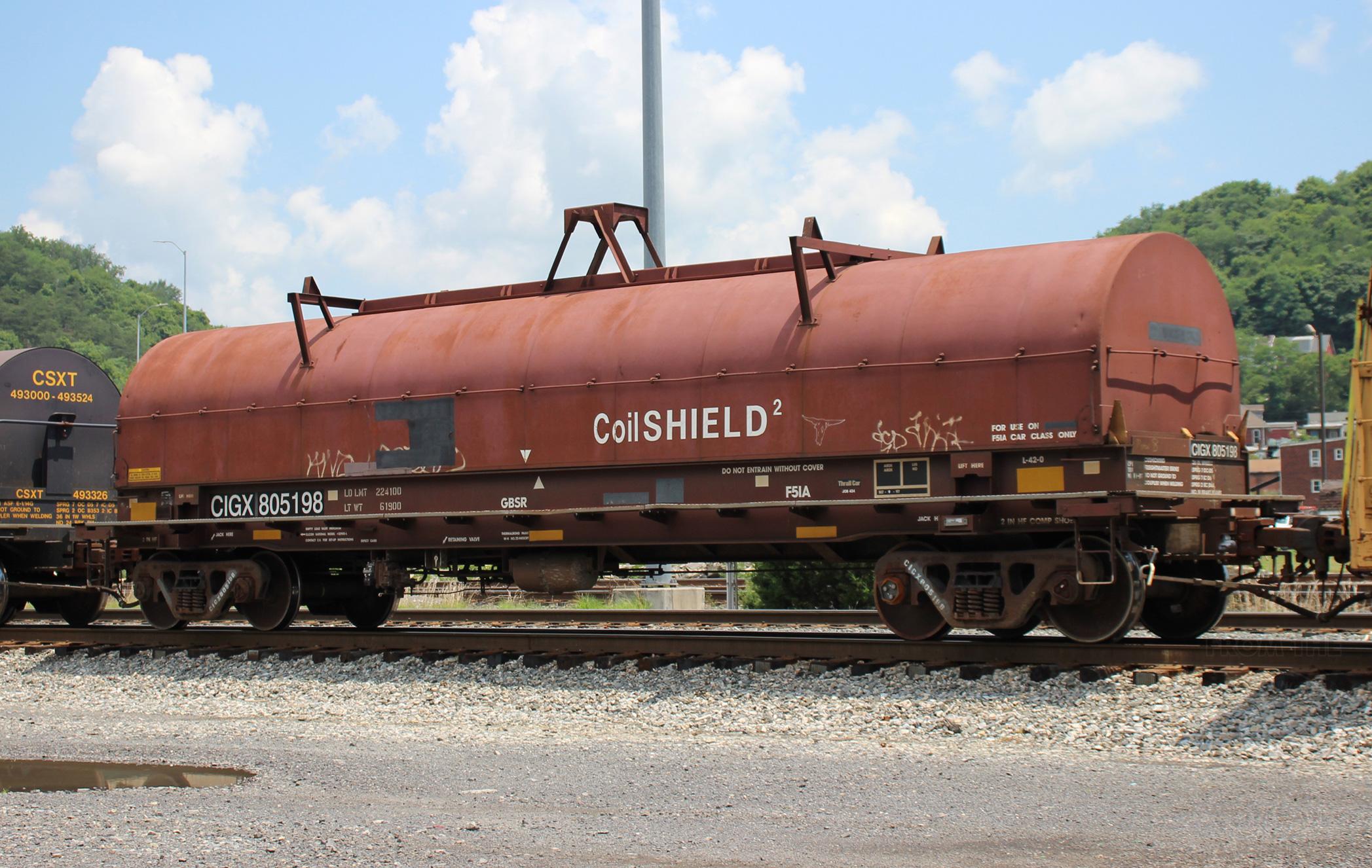 CIGX 805198 is seen in the consist of CSX L348-07 at Cumberland, MD on 7/8/20. Car is ex CR 623934 and was built 9-97 by Thrall as part of Job 424. Photo by Chris Carangi.