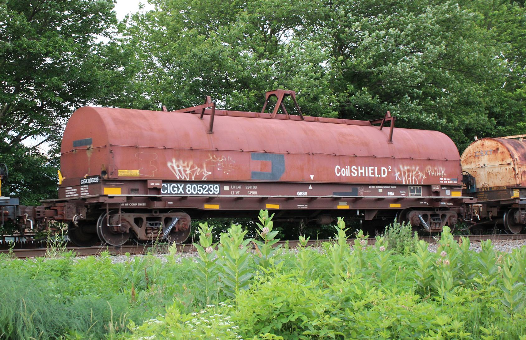 CIGX 805239 is seen in the consist of CSX Q409-19 at Newark, DE on 6/20/20. Car is ex CR 623975 and was built 10-97 by Thrall as part of Job 424. Photo by Chris Carangi.