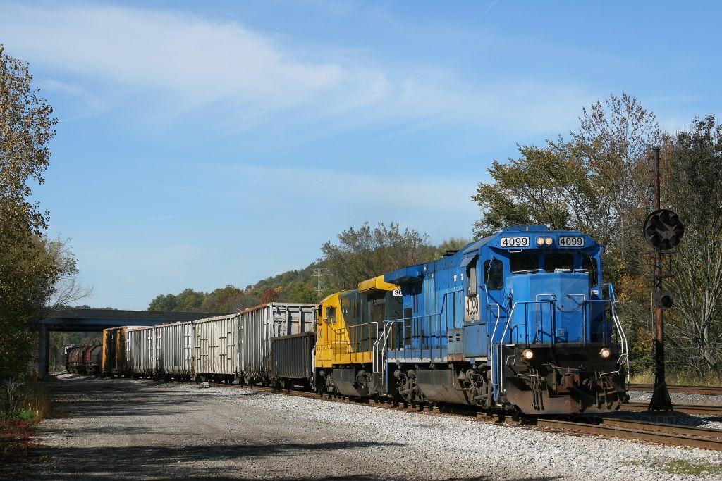 Ohio Central 4099, the former Conrail 2040, departs the CSX yard in Warwick(Clinton), Ohio. The engineers side has a complete paint out of the CR markings, but the far side has had the Conrail name and logo reapplied in non standard fashion. This unit came to Conrail via the MGA- it was their 2310.