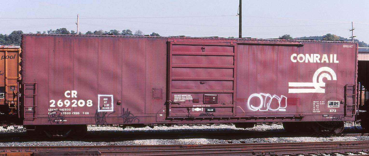 Previous Next Car is ex PC 269208. Photo By Jeff Weaver Equipment Type Class X72 Conrail Number 269208 Post Conrail Number 269208 Year 2000 Original Date 9/28/00 Collection CRHS Conrail Photo Archive Contributions