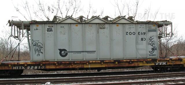Conrail Class H1K hopper 493002 is seen here on TTX flatcar HTTX 92913.