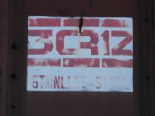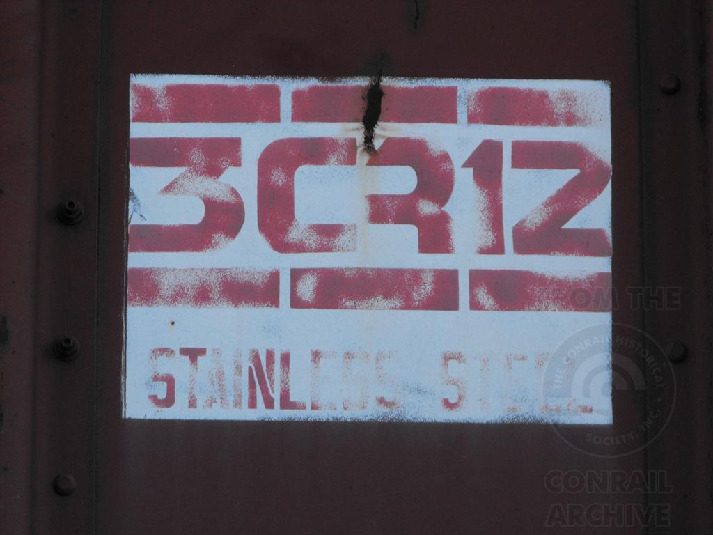 A close-up view of the Cromwell 3CR12 Stainless Steel logo on the side of CR 495344 is seen at Deepwater, NJ on 1/31/14. Car was built 9-93 by HCS.