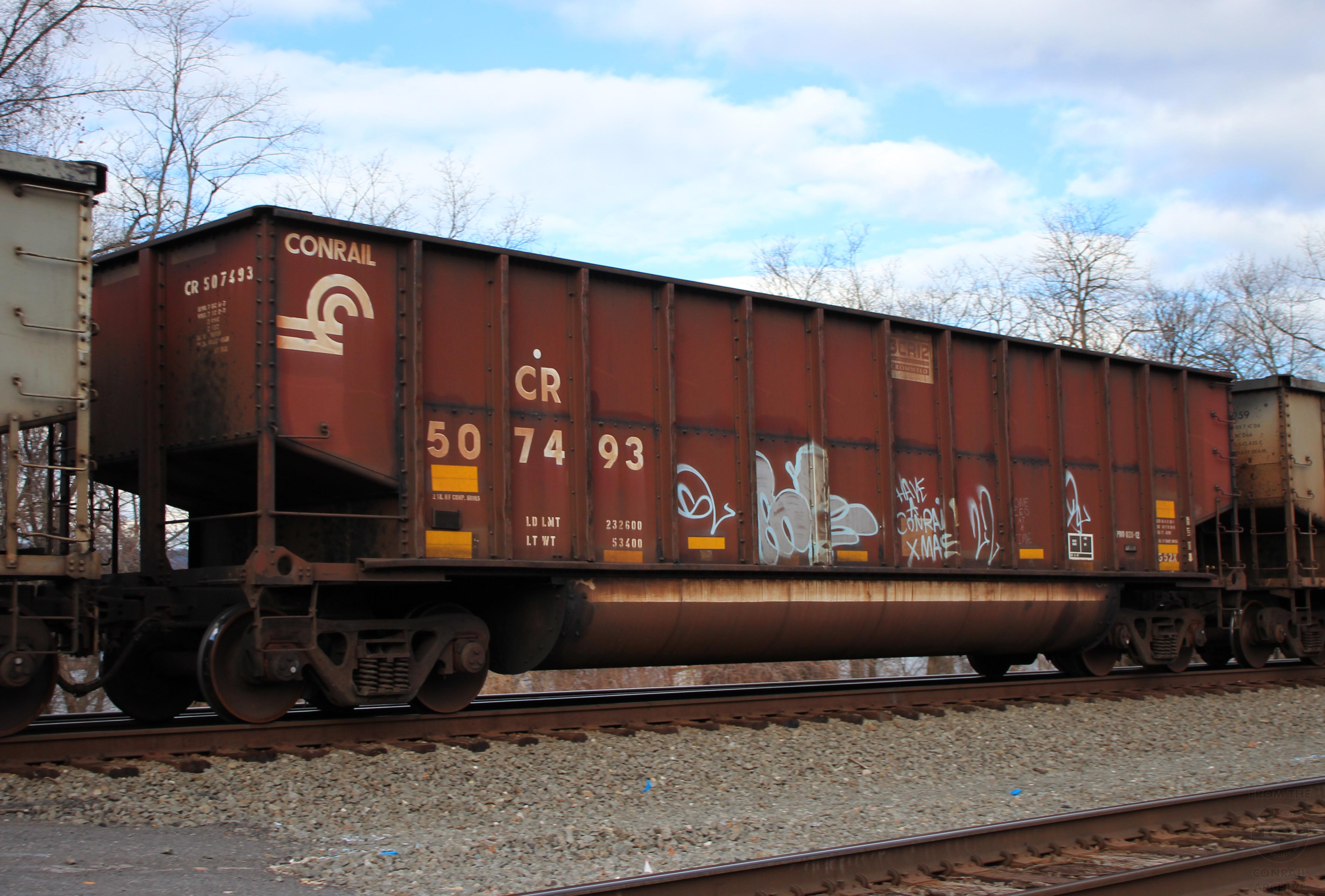CR 507493 is seen in the consist of NS Y91at Cove, PA on 3/1/25. Car was built 8-97 (painted 8-11-97) by HCS.