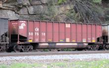 CR 507510 is seen in the consist of NS 595-10 as it rounds Horseshoe Curve in Altoona, PA on 8/10/24. Car was built 8-97(painted 8-17-97) by HCS.