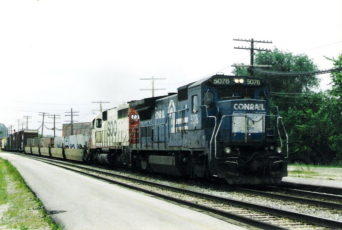 Conrail 5076(soon to become CSXT 5958) and a Soo Line SD40 lead Q351 thru Fostoria, OH on July 20, 1999. Photo by Chris Howe