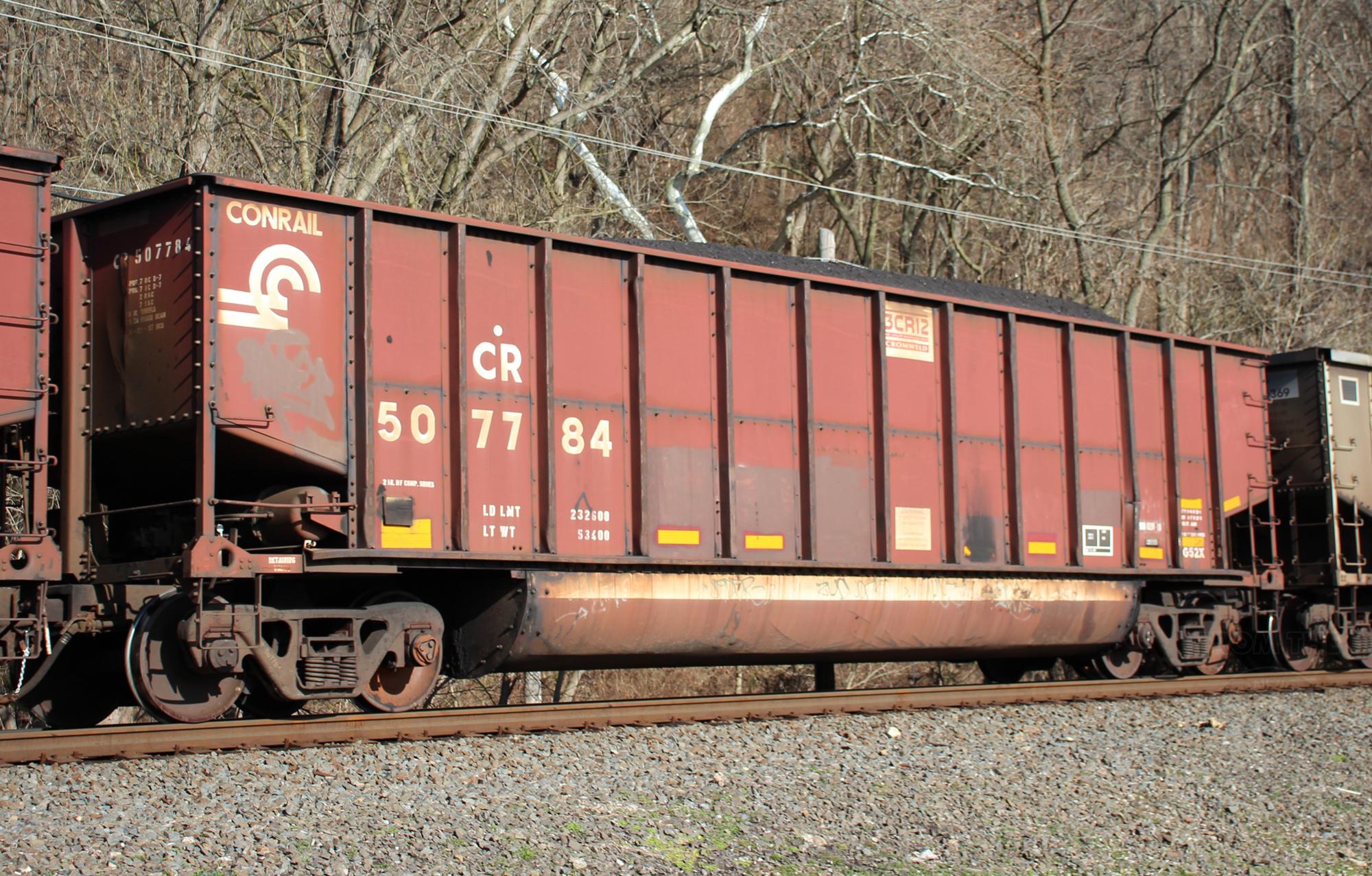 CR 507784 is seen in the consist of NS 590 at Port Deposit, MD on 3/3/24. Car was built 10-97 (painted 10-22-97) by HCS.