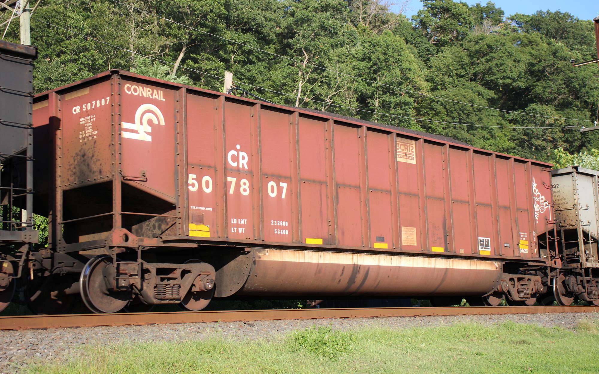 CR 507807 is seen in the consist of NS 590 at Port Deposit, MD on 8/20/22. Car was built 10-97 (painted 10-28-97) by HCS.