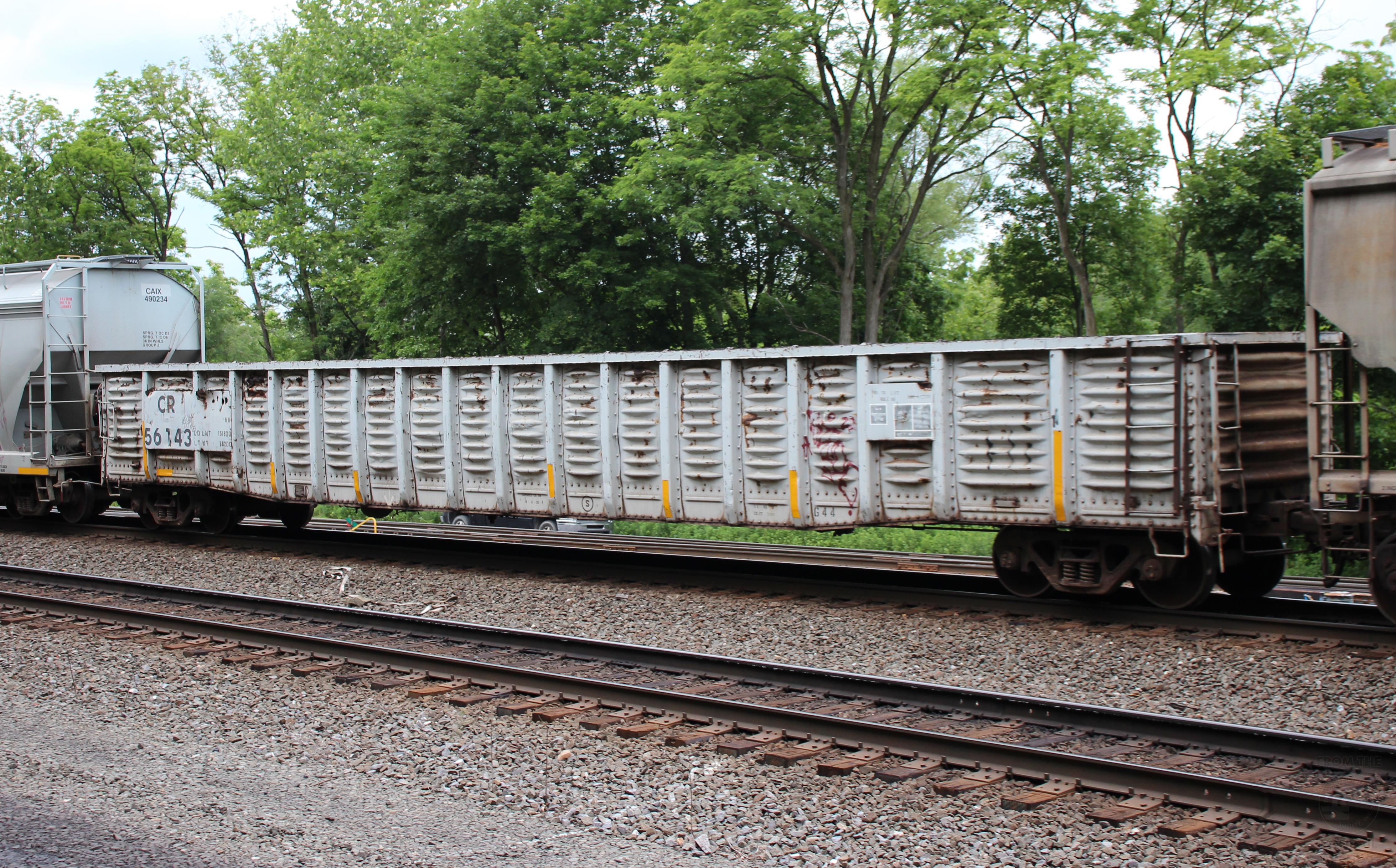 CR 56143 is seen in the consist of NS 12G at Tyrone, PA on 6/25/23. Car is ex PRR 442560, built 7-66, and was painted CR SR 8-8-95.