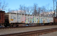 CR 56199 is seen in the consist of NS 11K at Cove, PA on 3/1/25. Car is ex PC 598414 and was built 6-68.