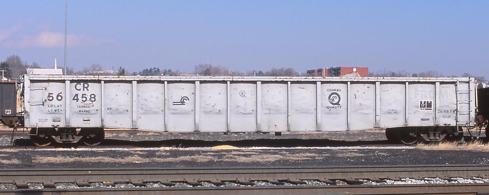 Previous Next Car is ex CR 559255/RDG 38300 and was built 10-66. It was deleted on 5-10-09. Photo By Jeff Weaver Equipment Type Class GR51M Conrail Number 56458 Post Conrail Owner CSX Post Conrail Number CSX 56458 Year 2002 Original Date 2/26/02 Collection CRHS Conrail Photo Archive Contributions