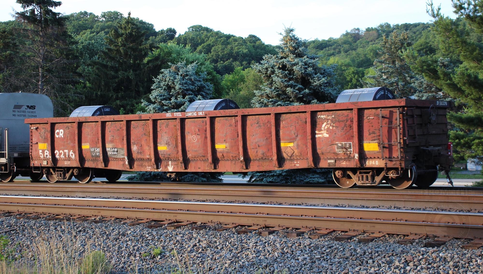 CR 582276is seen in the consist of NS C28 at Leetsdale, PA on 6/24/21.Car was built 7-84by CR and is now classed GP46 by NS.
