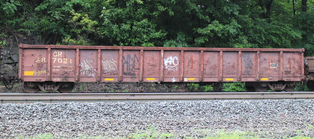 CR 587021 is seen in the consist of WB NS 60N as it rounds Horseshoe Curve in Altoona, PA on 6/16/16. Car is ex CR 601016/EL 44177, built 6-71 and was rebuilt 2-92.