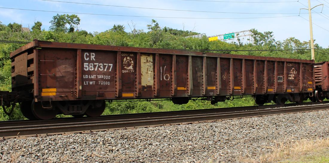 CR 587377 is seen in the consist of EB NS 61Z at Wyomissing, PA. Car is ex CR 583805/NYC unknown.