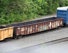 Conrail gondola #598835. Enola yard, PA. Check ouot the 'hand painted numbering and letters! Spotted on May 16, 2023