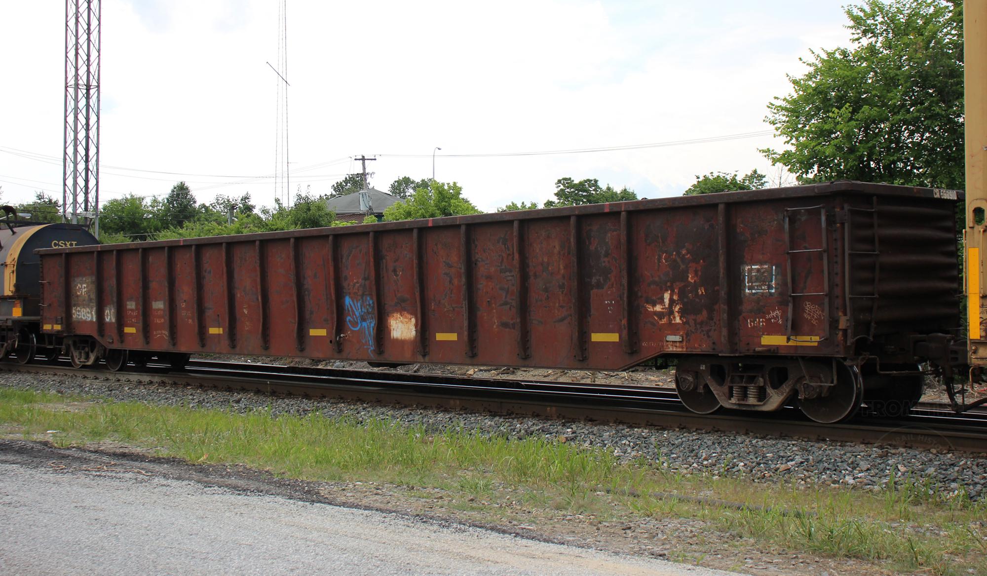 CR 598910 is seen in the consist of CSX M372-01 at Elsmere, DE on 7/2/22. Car is ex PC 598910, built 6-72 by Fruehauf, painted CR-DL 7-81 and is now owned by CSX.