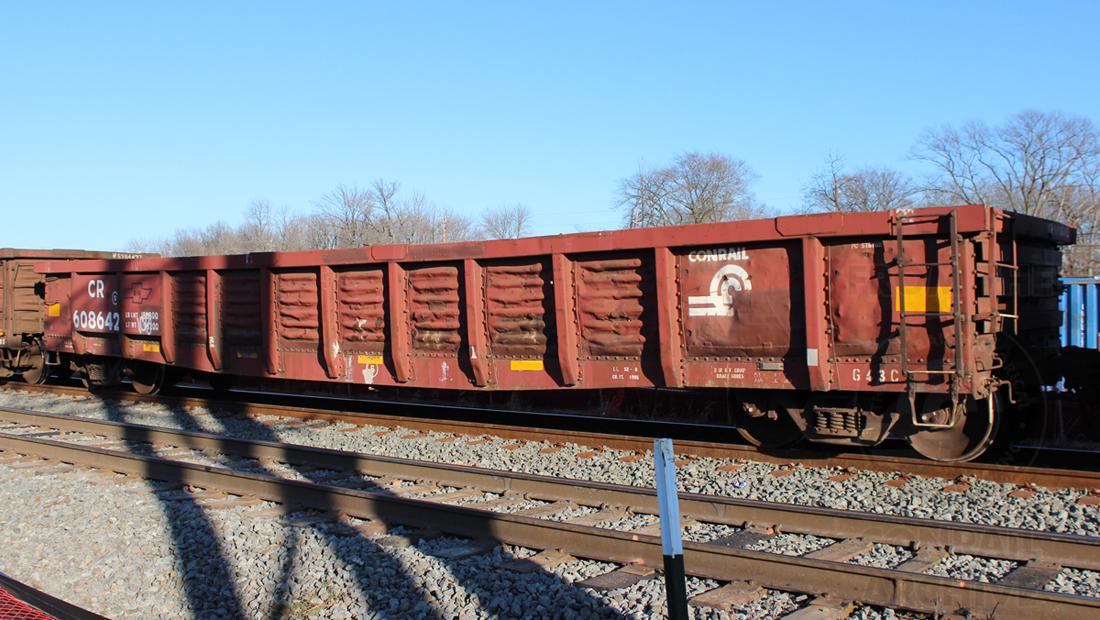 CR 608642 is seen at Westville, NJ on 2/13/15. Car is ex CR 578769/PC 578769 and was built 3-70. Car is wearing a number that was used in Coil Steel service, but has since had the coil cradle removed and is now is now in steel slab service.
