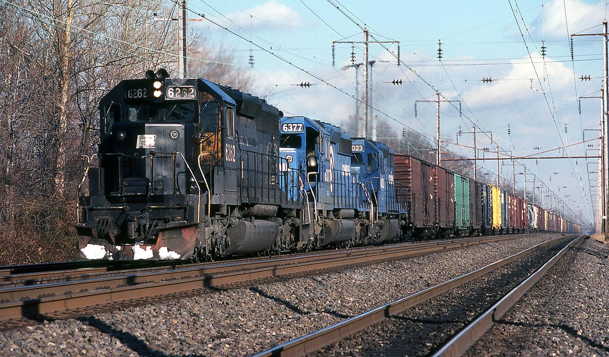 Five years and eight months after the birth of "Big Blue", blackberry ex Penn Central SD40-6262 is leading two CR blueberries, SD40-2 6377 & SD35 6023, on a S/B freight on Amtrak's Northeast Corridor, about to cross Martin Blvd in Middle River, MD.