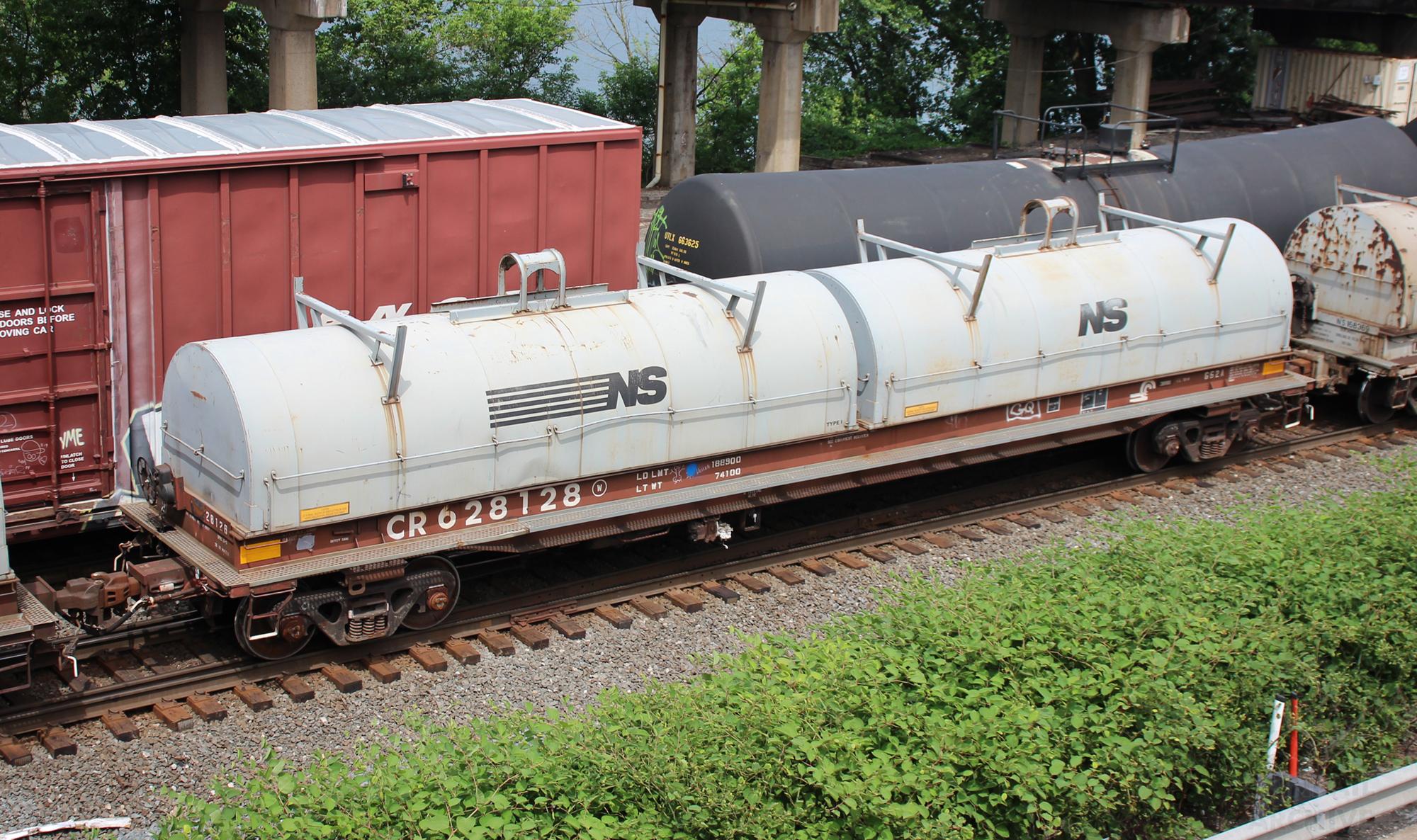 CR 628128 is seen in the consist of NS C28 at Baden (East Conway), PA on 6/16/22. Car was built 10-77 by Thrall as part of Job 698.