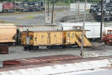 With NS C40-8W 8420 (CR 6231) working the yard, and GP38-2 5301 (CR 8113) resting in lines of NS black, CR 64718 (built Feb 1929) and snowplow CR 64572 (built 1946) wait for winter snow at Enola on August 25, 2014.